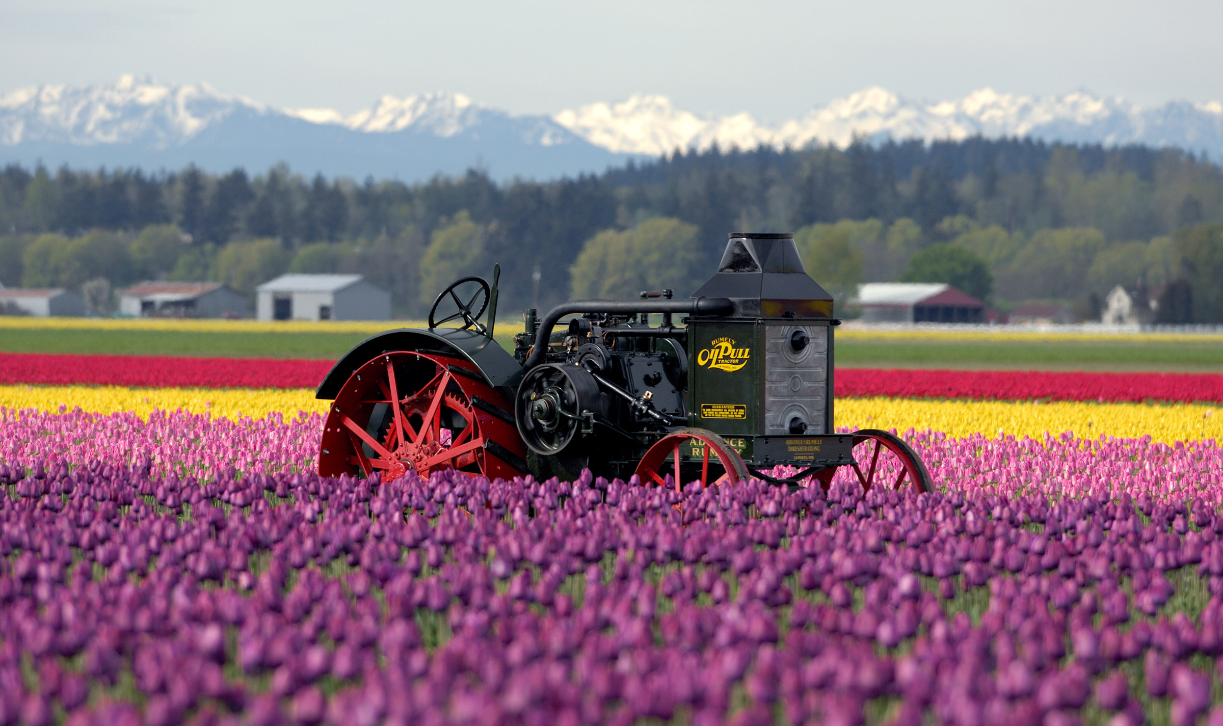Antique tractor in tulip fields with snowcapped Olympic Mountains in the background