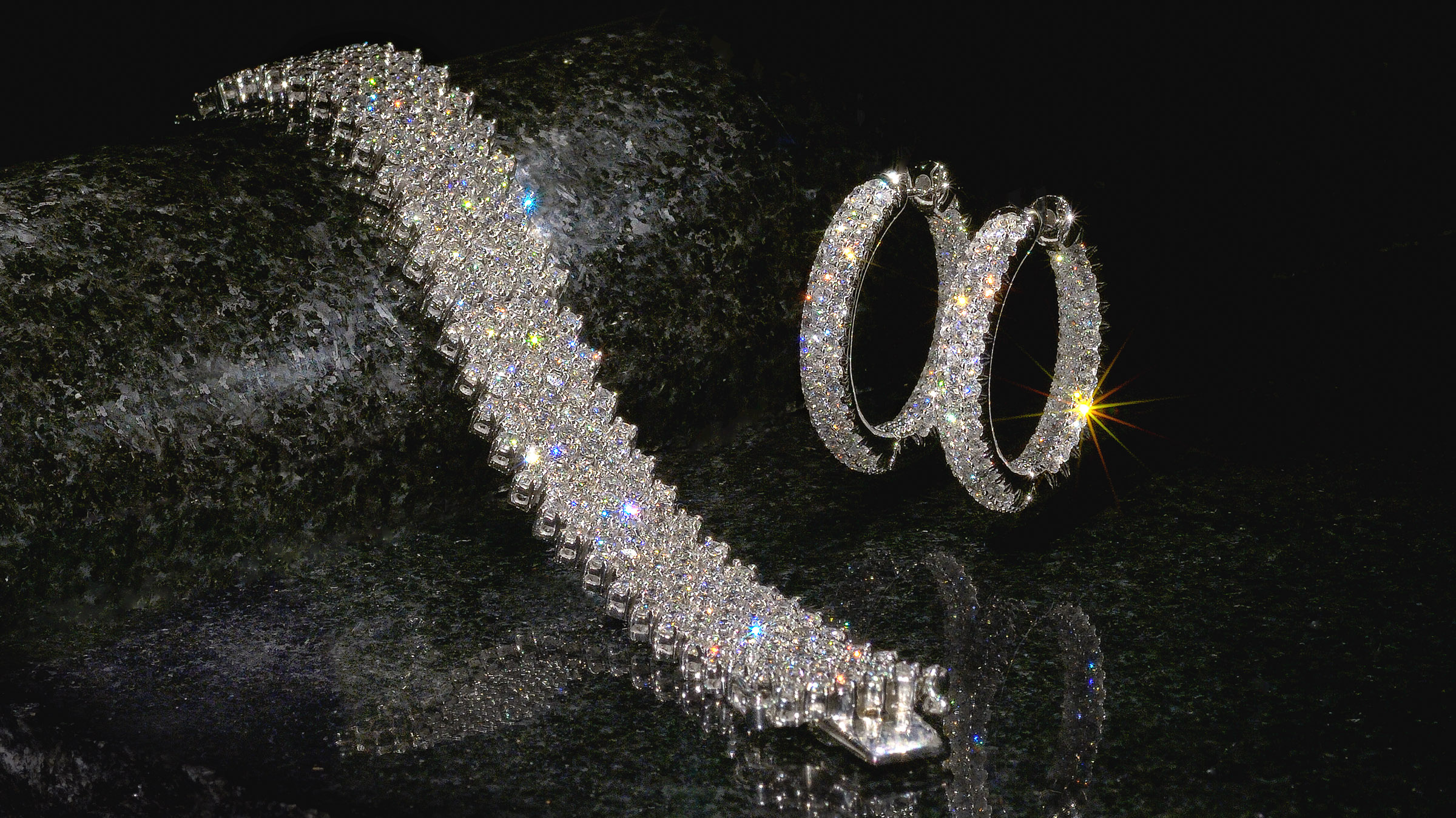 From a series shot with a custom-built, proprietary lighting system designed to capture the inner fire, fine jewelry sparkles for the camera. In this shot, a 20 carat pave’ bracelet and diamond earrings bedazzle the eye. Jerry and Lois Photography